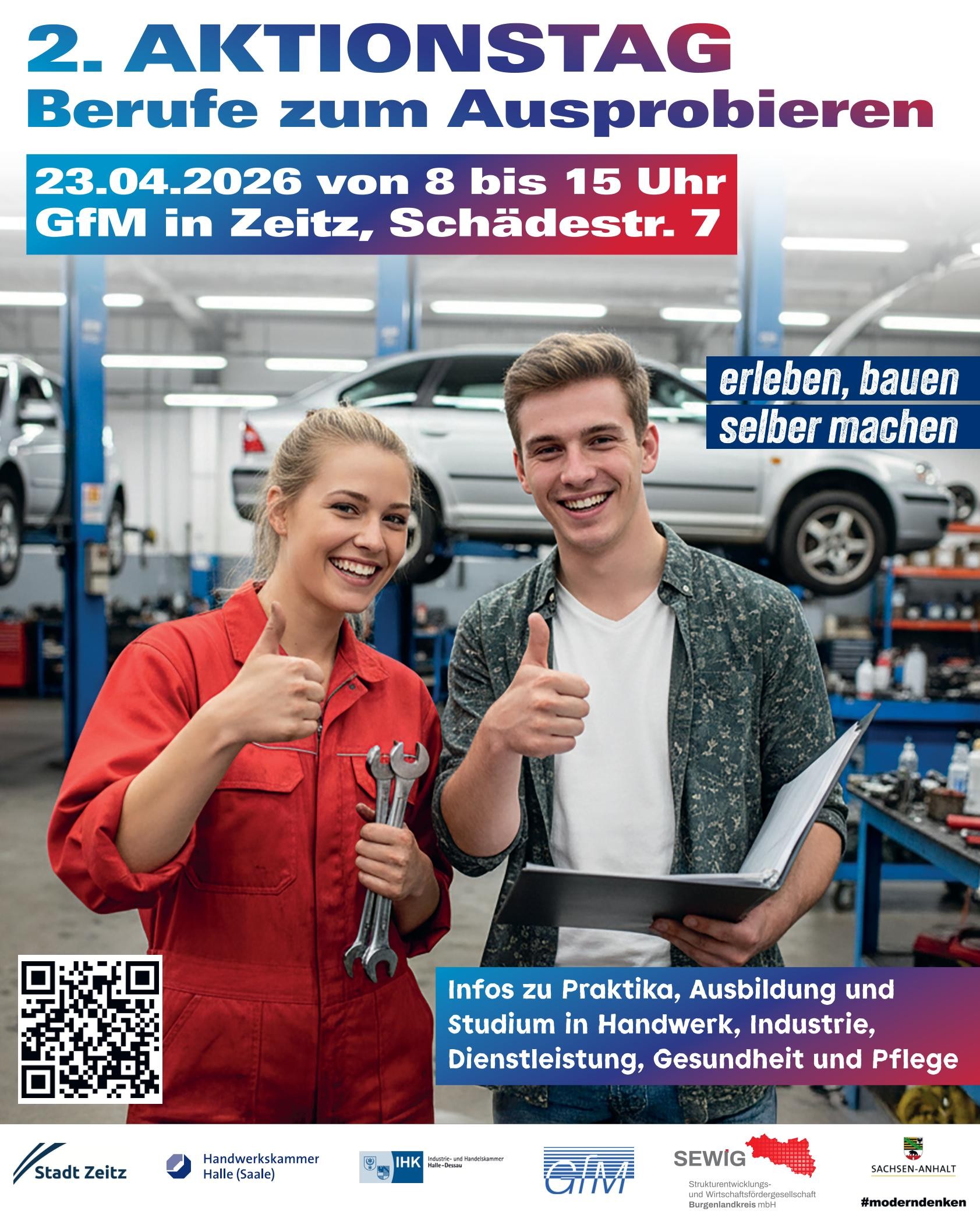 Wir laden Sie recht herzlich zum 2. Aktionstag “Berufe zum Ausprobieren“ bei der GFM GmbH & Co. KG in Zeitz ein. Der Aktionstag wird von der Stadt Zeitz in Kooperation mit der Handwerkskammer Halle, der Industrie- und Handelskammer Halle-Dessau Geschäftsstelle Weißenfels, SEWIG Burgenlandkreis und der GFM GmbH & Co. KG organisiert.